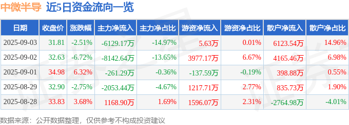 证券之星消息,截至2025年9月3日收盘,中微半导(688380)报收于31.81元,下跌2.51%,换手率7.49%,成交量12.66万手,成交额4.09亿元。