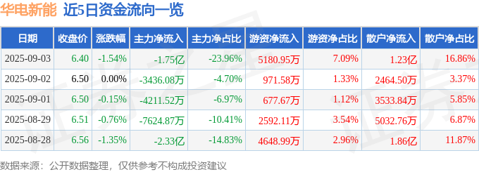 证券之星消息,截至2025年9月3日收盘,华电新能(600930)报收于6.4元,下跌1.54%,换手率4.53%,成交量113.58万手,成交额7.3亿元。