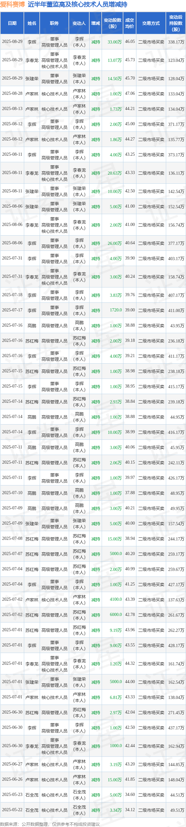 爱科赛博近半年内的董监高及核心技术人员增减持详情如下: