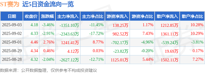 证券之星消息,截至2025年9月3日收盘,ST赛为(300044)报收于4.18元,下跌3.46%,换手率3.91%,成交量27.94万手,成交额1.18亿元。