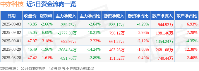 证券之星消息,截至2025年9月3日收盘,中亦科技(301208)报收于43.85元,下跌2.66%,换手率6.13%,成交量3.07万手,成交额1.36亿元。
