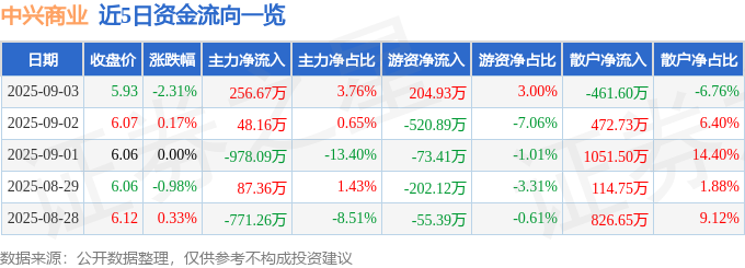 证券之星消息,截至2025年9月3日收盘,中兴商业(000715)报收于5.93元,下跌2.31%,换手率2.11%,成交量11.36万手,成交额6824.43万元。