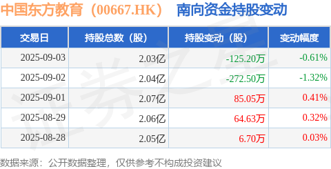 证券之星消息,9月3日南向资金减持125.2万股中国东方教育(00667.HK)。近5个交易日中,获南向资金减持的有2天,累计净减持241.32万股。近20个交易日中,获南向资金减持的有16天,累计净减持3630.22万股。截至目前,南向资金持有中国东方教育(00667.HK)2.03亿股,占公司已发行普通股的9.16%。