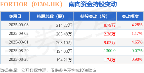 证券之星消息,9月3日南向资金增持8.79万股FORTIOR(01304.HK)。近5个交易日中,获南向资金增持的有4天,累计净增持21.8万股。近20个交易日中,获南向资金增持的有19天,累计净增持207.97万股。截至目前,南向资金持有FORTIOR(01304.HK)214.27万股,占公司已发行普通股的9.93%。