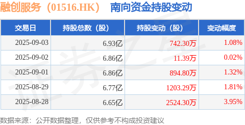 证券之星消息,9月3日南向资金增持742.3万股融创服务(01516.HK)。近5个交易日中,获南向资金增持的有5天,累计净增持5376.08万股。近20个交易日中,获南向资金增持的有12天,累计净增持4851.14万股。截至目前,南向资金持有融创服务(01516.HK)6.93亿股,占公司已发行普通股的22.68%。