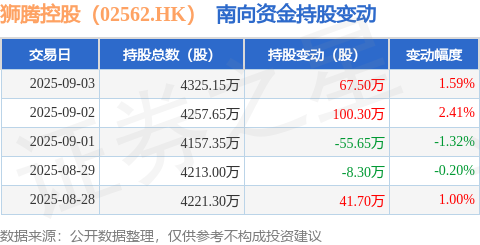 证券之星消息,9月3日南向资金增持67.5万股狮腾控股(02562.HK)。近5个交易日中,获南向资金增持的有3天,累计净增持145.55万股。近20个交易日中,获南向资金增持的有10天,累计净增持117.45万股。截至目前,南向资金持有狮腾控股(02562.HK)4325.15万股,占公司已发行普通股的9.43%。