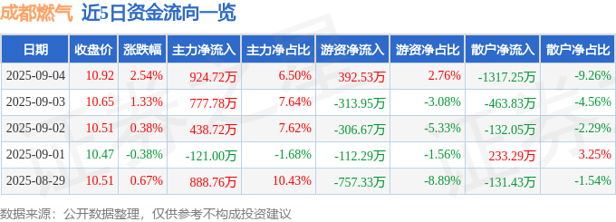 证券之星消息,截至2025年9月4日收盘,成都燃气(603053)报收于10.92元,上涨2.54%,换手率1.49%,成交量13.25万手,成交额1.42亿元。