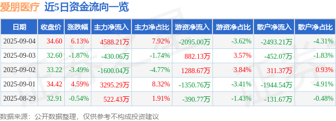 证券之星消息,截至2025年9月4日收盘,爱朋医疗(300753)报收于34.6元,上涨6.13%,换手率19.27%,成交量16.94万手,成交额5.79亿元。