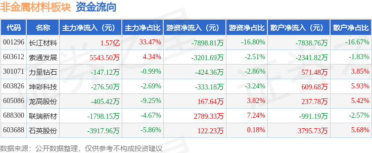 从资金流向上来看,当日非金属材料板块主力资金净流入1.47亿元,游资资金净流出8778.83万元,散户资金净流出5957.1万元。非金属材料板块个股资金流向见下表: