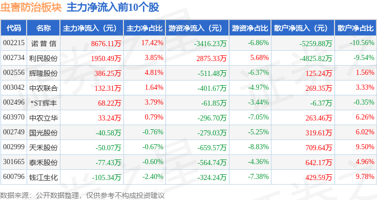 从资金流向上来看,当日虫害防治板块主力资金净流出9274.87万元,游资资金净流出1.06亿元,散户资金净流入1.99亿元。虫害防治板块个股资金流向见下表: