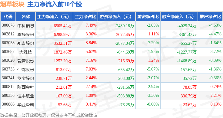 从资金流向上来看,当日烟草板块主力资金净流入4812.7万元,游资资金净流出5961.28万元,散户资金净流入1148.58万元。烟草板块个股资金流向见下表: