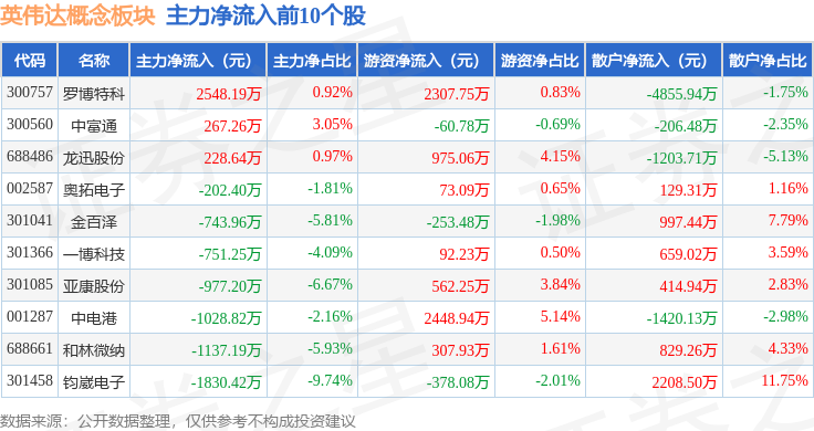 从资金流向上来看,当日英伟达概念板块主力资金净流出35.84亿元,游资资金净流入3.95亿元,散户资金净流入31.89亿元。英伟达概念板块个股资金流向见下表: