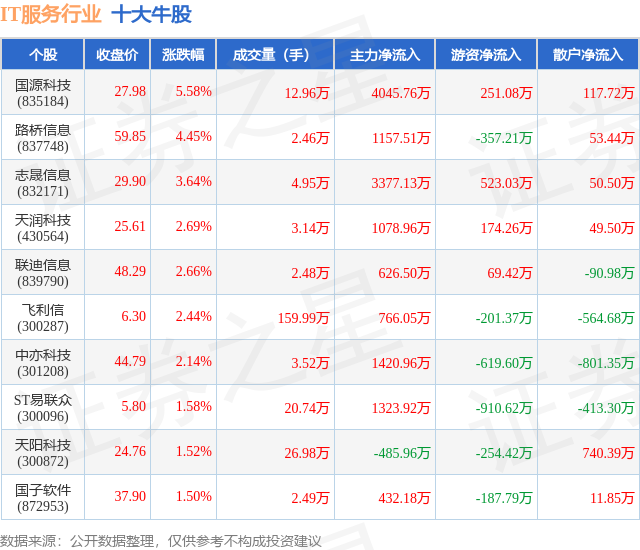 个股表现方面,IT服务行业当日领涨股为国源科技(835184),该股当日报收27.98,上涨5.58%,成交量12.96万,主力资金净流入4045.76万元。路桥信息(837748)以上涨4.45%紧随其后,该股当日成交量2.46万,主力资金净流入1157.51万元。除此之外,志晟信息(832171)、天润科技(430564)、联迪信息(839790)均进入当日牛股之列。具体个股列表见下表: