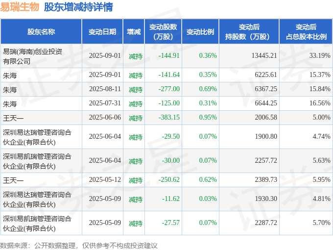 截至2025年9月4日收盘,易瑞生物(300942)报收于12.83元,下跌0.85%,换手率2.54%,成交量10.28万手,成交额1.34亿元。