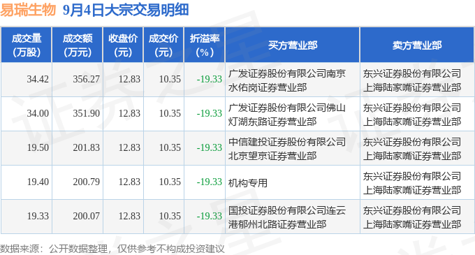 证券之星消息,9月4日易瑞生物发生大宗交易,交易数据如下: