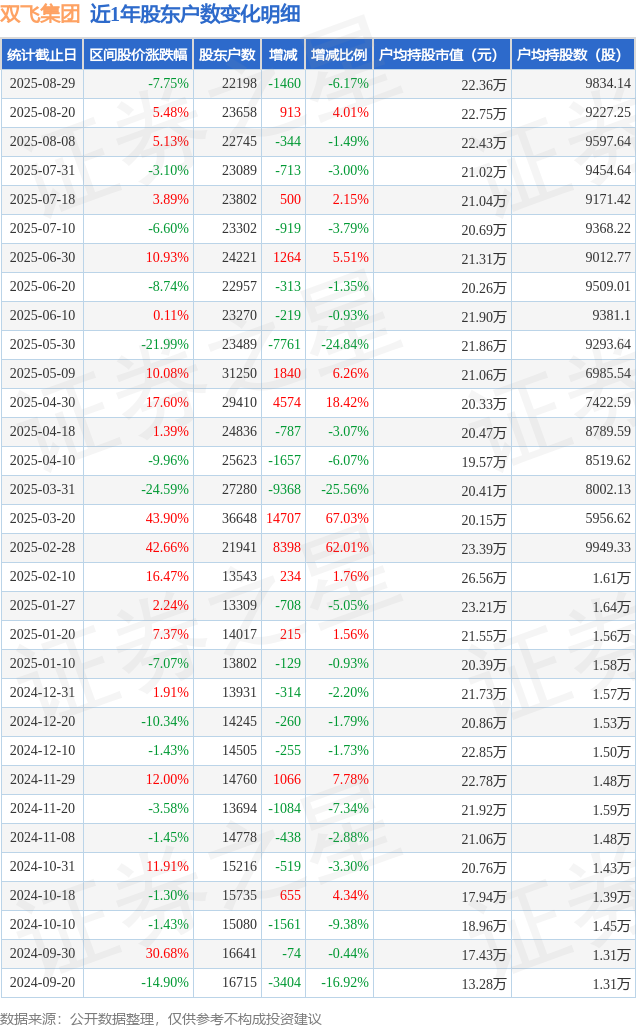 从股价来看,2025年8月20日至2025年8月29日,双飞集团区间跌幅为7.75%,在此期间股东户数减少1460.0户,减幅为6.17%。