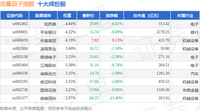 证券之星消息,9月4日,动量因子(980057)指数报收于2142.13点,跌2.56%,成交524.57亿元,换手率2.31%。当日该指数成份股中,上涨的有9家,金龙羽以10.01%的涨幅领涨,下跌的有41家,鼎泰高科以13.4%的跌幅领跌。