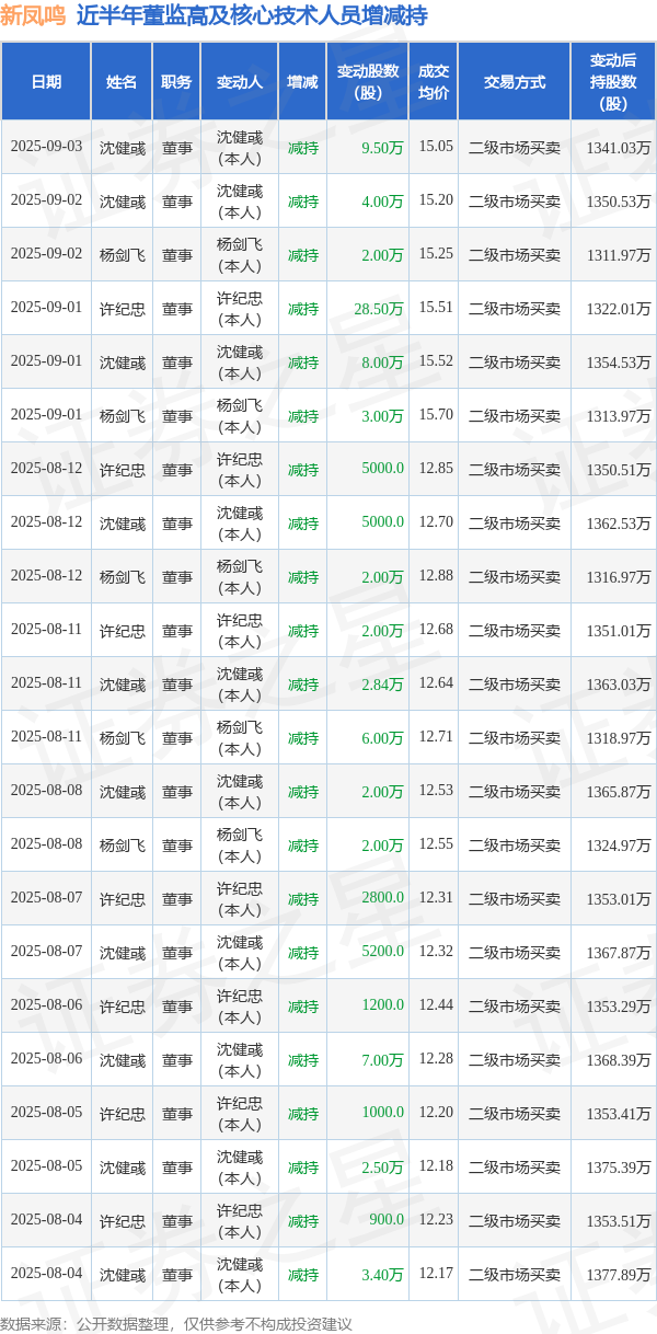新凤鸣近半年内的董监高及核心技术人员增减持详情如下: