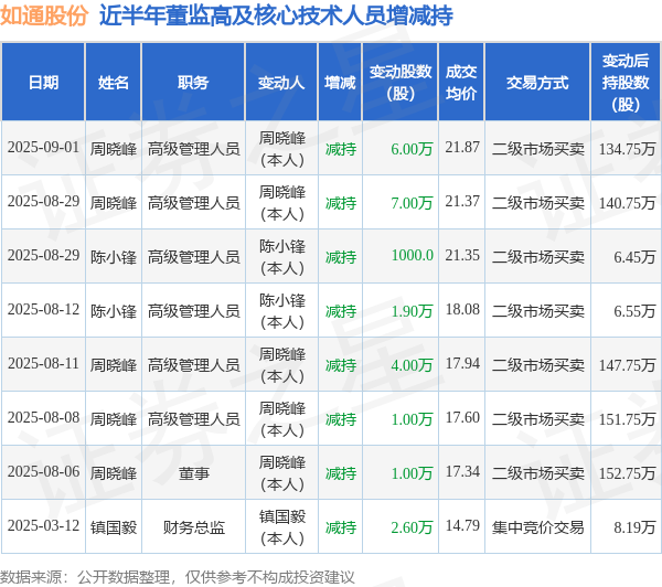 如通股份近半年内的董监高及核心技术人员增减持详情如下:
