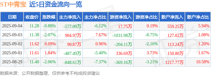 证券之星消息,截至2025年9月4日收盘,ST中青宝(300052)报收于11.28元,下跌0.88%,换手率3.16%,成交量8.28万手,成交额9422.17万元。