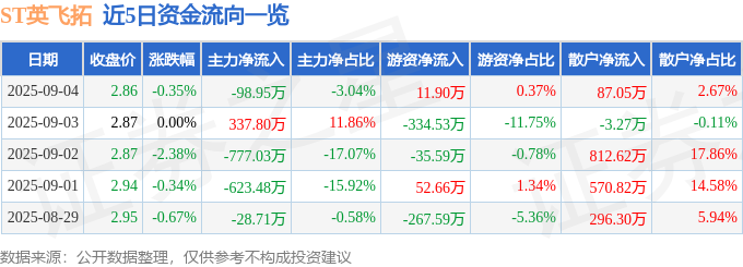 证券之星消息,截至2025年9月4日收盘,ST英飞拓(002528)报收于2.86元,下跌0.35%,换手率1.09%,成交量11.4万手,成交额3259.82万元。