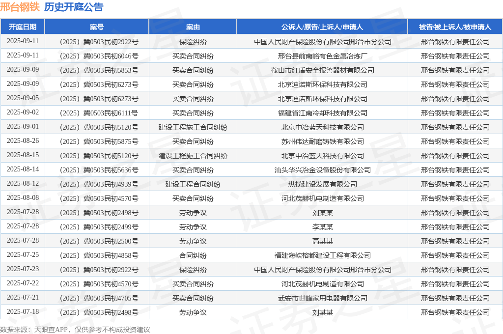 案号:(2025)冀0503民初6273号根据统计,近一年内以邢台钢铁有限责任公司为当事人的历史开庭公告有94则,其中案由为“劳动争议”的公告以43则居首,其次为“买卖合同纠纷”有32则,“建设工程施工合同纠纷”有6则。历史开庭公告(前20条)如下: