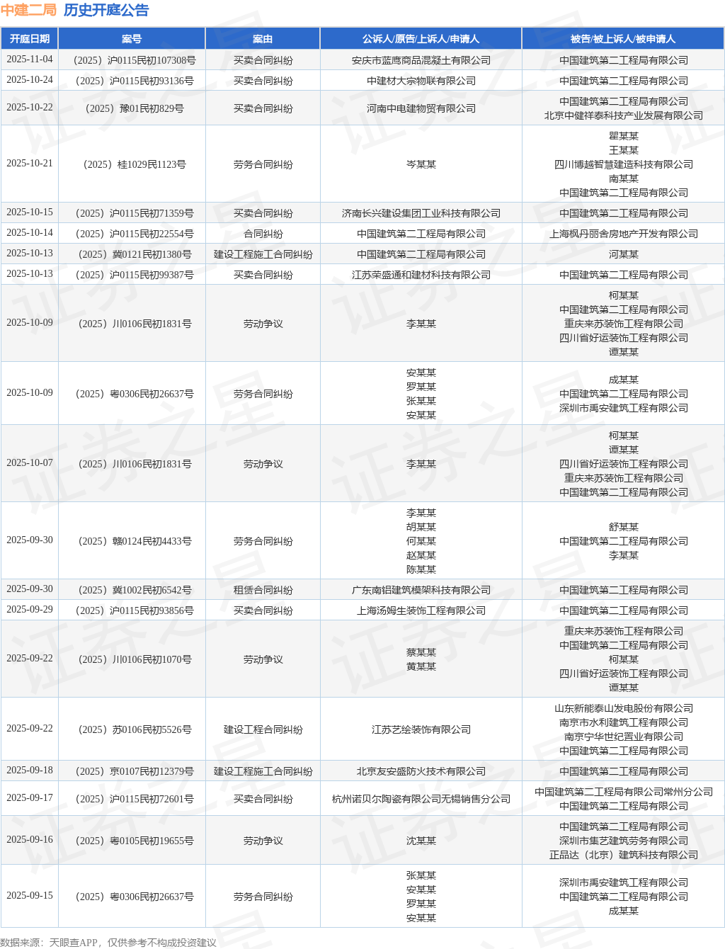 案号:(2025)辽01民终13940号根据统计,近一年内以中国建筑第二工程局有限公司为当事人的历史开庭公告有2150则,其中案由为“买卖合同纠纷”的公告以627则居首,其次为“劳务合同纠纷”有290则,“建设工程施工合同纠纷”有268则。历史开庭公告(前20条)如下: