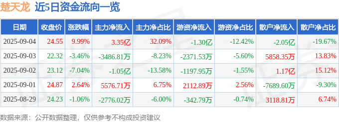 证券之星消息,截至2025年9月4日收盘,楚天龙(003040)报收于24.55元,上涨9.99%,涨停,换手率9.62%,成交量43.95万手,成交额10.43亿元。