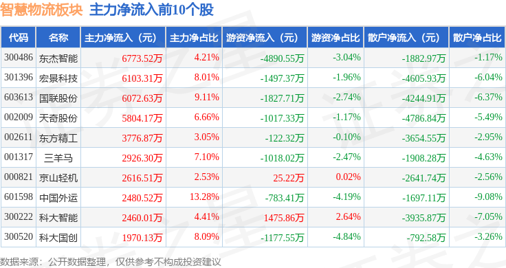 从资金流向上来看,当日智慧物流板块主力资金净流出10.64亿元,游资资金净流入1.83亿元,散户资金净流入8.8亿元。智慧物流板块个股资金流向见下表: