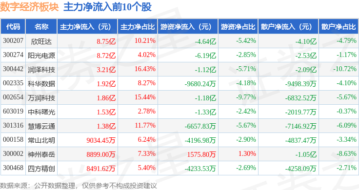 从资金流向上来看,当日数字经济板块主力资金净流入30.13亿元,游资资金净流出22.67亿元,散户资金净流出7.46亿元。数字经济板块个股资金流向见下表: