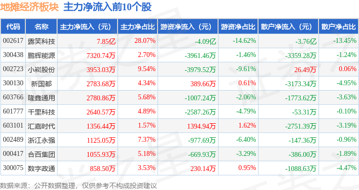 从资金流向上来看,当日地摊经济板块主力资金净流出3.3亿元,游资资金净流入1.03亿元,散户资金净流入2.27亿元。地摊经济板块个股资金流向见下表: