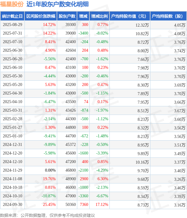 从股价来看,2025年7月31日至2025年8月29日,福星股份区间涨幅为14.72%,在此期间股东户数增加300.0户,增幅为0.77%。