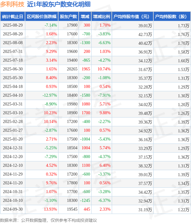 从股价来看,2025年8月20日至2025年8月29日,多利科技区间跌幅为7.14%,在此期间股东户数增加300.0户,增幅为1.7%。
