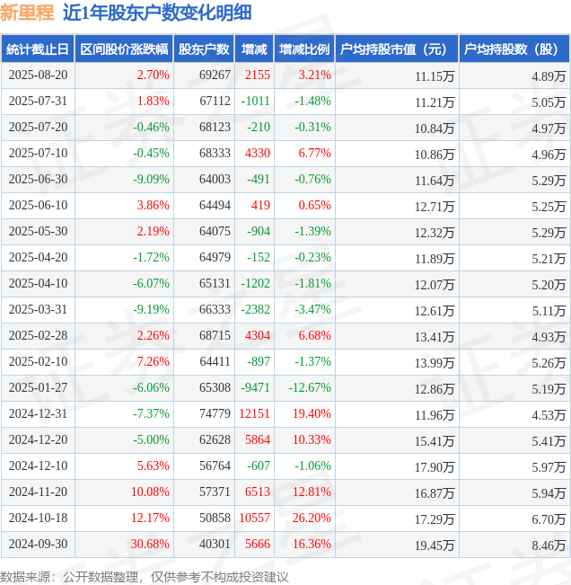 从股价来看,2025年7月31日至2025年8月20日,新里程区间涨幅为2.7%,在此期间股东户数增加2155.0户,增幅为3.21%。