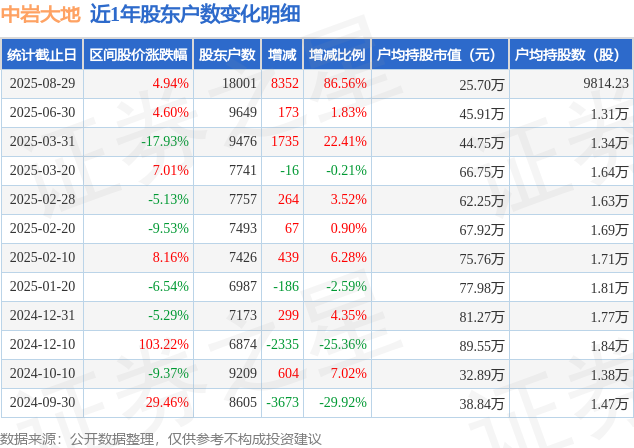 从股价来看,2025年6月30日至2025年8月29日,中岩大地区间涨幅为4.94%,在此期间股东户数增加8352.0户,增幅为86.56%。