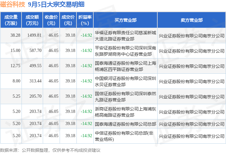 证券之星消息,9月5日磁谷科技发生大宗交易,交易数据如下: