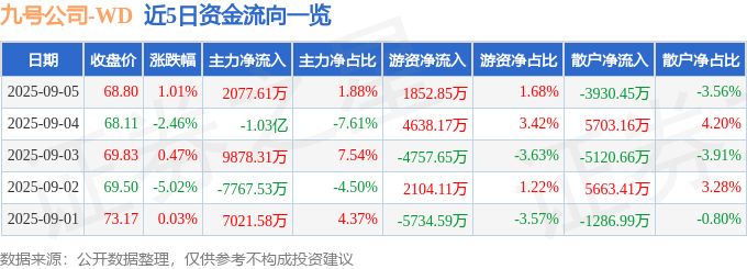 证券之星消息,截至2025年9月5日收盘,九号公司(689009)报收于68.8元,上涨1.01%,换手率2.9%,成交量16.14万手,成交额11.03亿元。