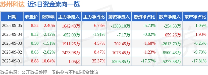 证券之星消息,截至2025年9月5日收盘,苏州科达(603660)报收于8.52元,上涨2.4%,换手率5.41%,成交量28.78万手,成交额2.42亿元。