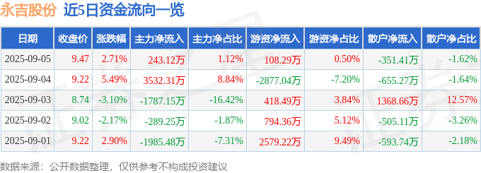 证券之星消息,截至2025年9月5日收盘,永吉股份(603058)报收于9.47元,上涨2.71%,换手率5.59%,成交量23.42万手,成交额2.17亿元。