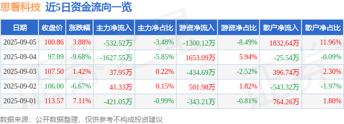 证券之星消息,截至2025年9月5日收盘,思看科技(688583)报收于100.86元,上涨3.88%,换手率8.72%,成交量1.54万手,成交额1.53亿元。