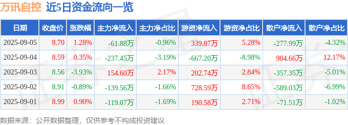 证券之星消息,截至2025年9月5日收盘,万讯自控(300112)报收于8.7元,上涨1.28%,换手率3.13%,成交量7.43万手,成交额6441.7万元。