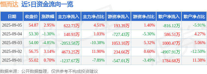 9月5日的资金流向数据方面,主力资金净流入622.73万元,占总成交额4.51%,游资资金净流入193.39万元,占总成交额1.4%,散户资金净流出816.12万元,占总成交额5.91%。