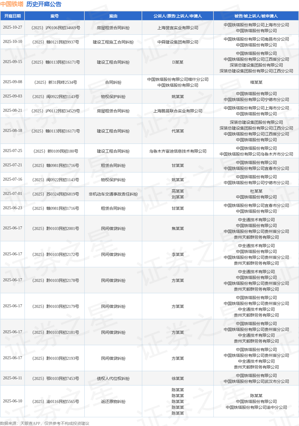 案号:(2025)新31民终2534号根据统计,近一年内以中国铁塔股份有限公司为当事人的历史开庭公告有62则,其中案由为“建设工程施工合同纠纷”的公告以10则居首,其次为“排除妨害纠纷”有7则,“民间借贷纠纷”有6则。历史开庭公告(前20条)如下: