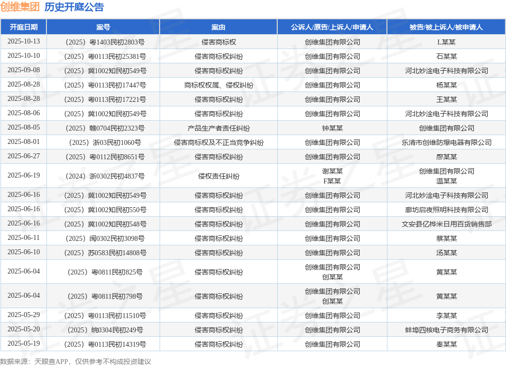 案号:(2025)冀1002知民初549号根据统计,近一年内以创维集团有限公司为当事人的历史开庭公告有61则,其中案由为“侵害商标权纠纷”的公告以45则居首,其次为“商标权权属、侵权纠纷”有5则,“侵害作品信息网络传播权”有2则。历史开庭公告(前20条)如下: