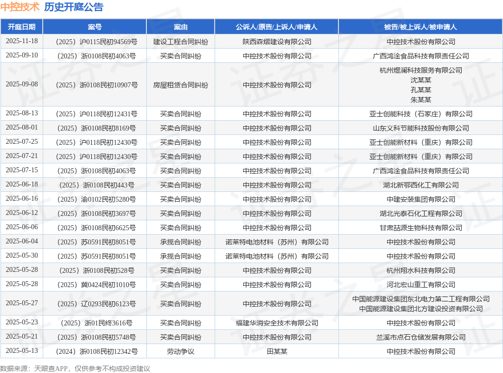 案号:(2025)浙0108民初10907号根据统计,近一年内以中控技术股份有限公司为当事人的历史开庭公告有38则,其中案由为“买卖合同纠纷”的公告以31则居首,其次为“承揽合同纠纷”有3则,“劳动争议”有1则。历史开庭公告(前20条)如下:
