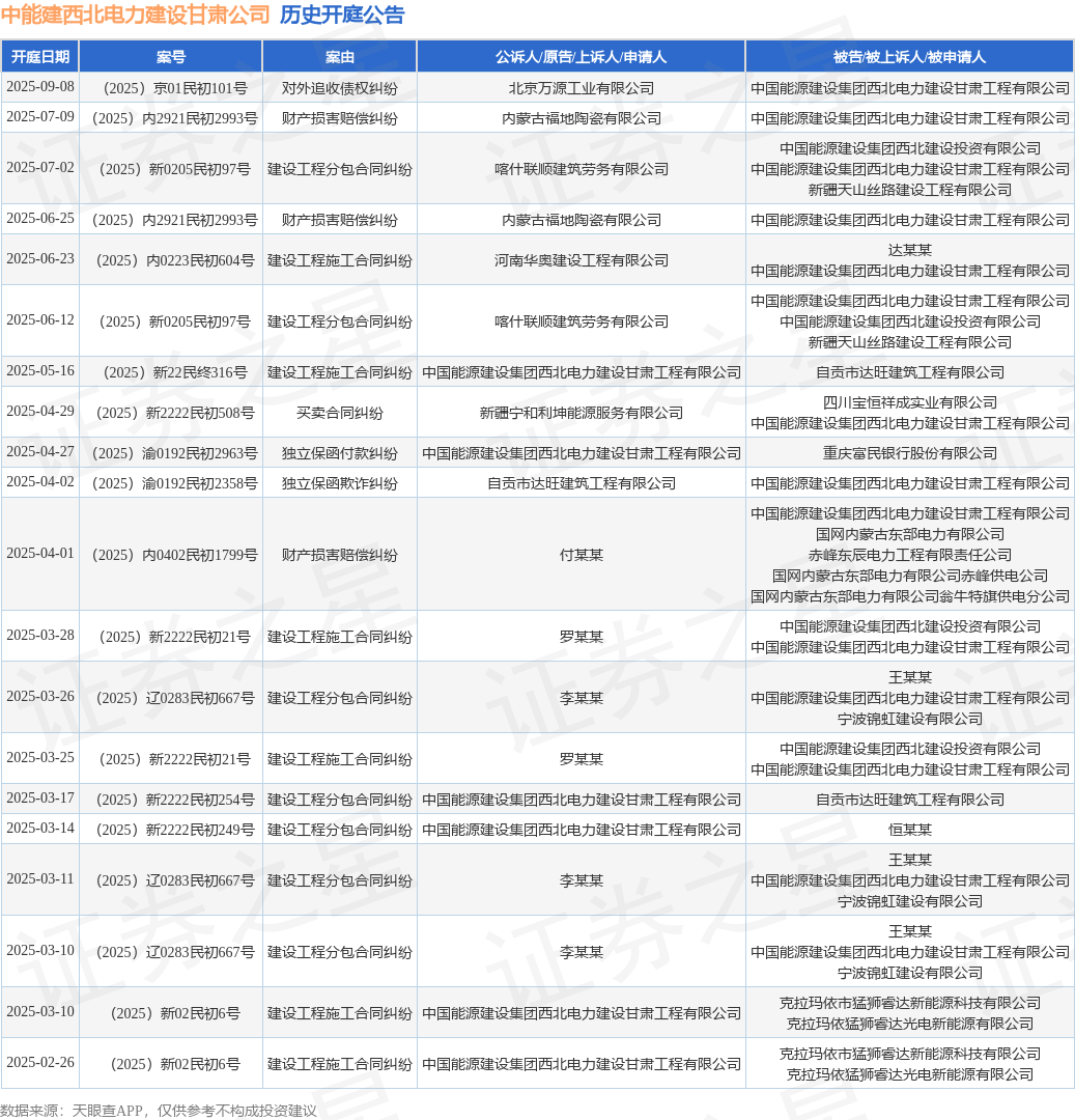 案号:(2025)京01民初101号根据统计,近一年内以中国能源建设集团西北电力建设甘肃工程有限公司为当事人的历史开庭公告有23则,其中案由为“建设工程分包合同纠纷”的公告以7则居首,其次为“建设工程施工合同纠纷”有7则,“财产损害赔偿纠纷”有3则。历史开庭公告(前20条)如下:
