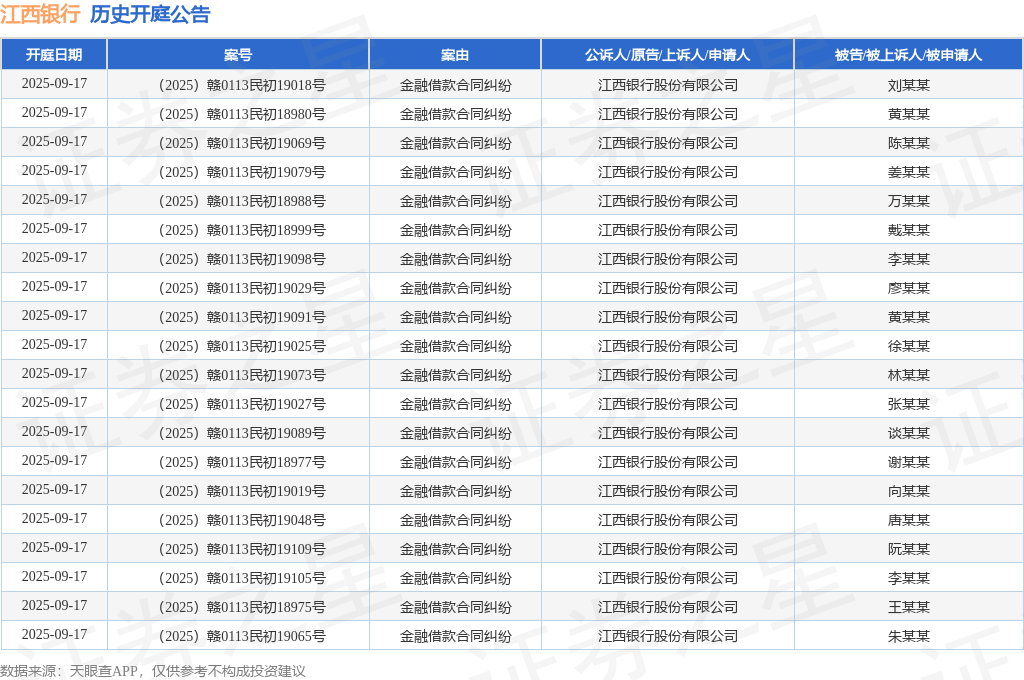 证券之星消息,根据天眼查APP显示,近日公布了一则江西银行股份有限公司作为原告/上诉人的开庭公告,详细内容如下: