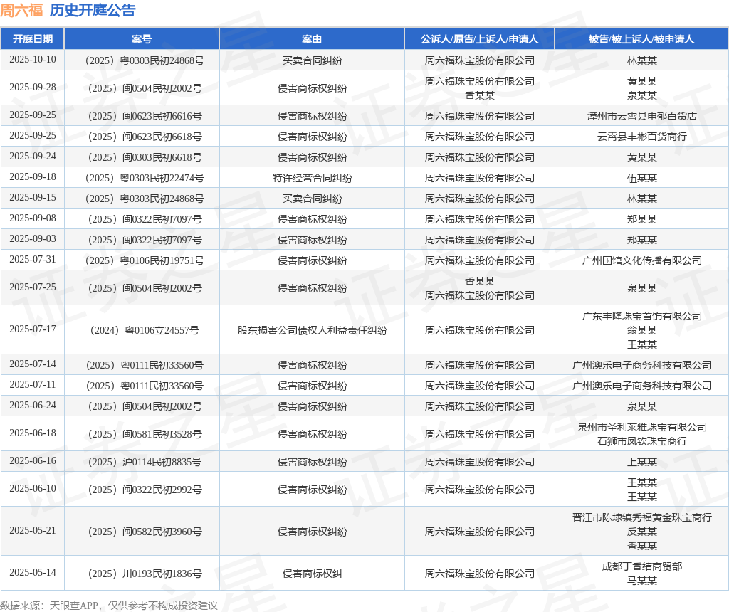 案号:(2025)闽0322民初7097号根据统计,近一年内以周六福珠宝股份有限公司为当事人的历史开庭公告有44则,其中案由为“侵害商标权纠纷”的公告以30则居首,其次为“合同纠纷”有3则,“商标行政纠纷”有3则。历史开庭公告(前20条)如下: