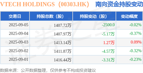 证券之星消息,9月5日南向资金减持2500.0股VTECH HOLDINGS(00303.HK)。近5个交易日中,获南向资金减持的有4天,累计净减持12.03万股。近20个交易日中,获南向资金增持的有13天,累计净增持86.04万股。截至目前,南向资金持有VTECH HOLDINGS(00303.HK)1407.72万股,占公司已发行普通股的5.55%。
