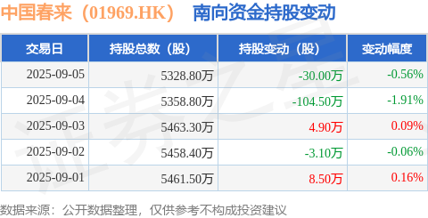证券之星消息,9月5日南向资金减持30.0万股中国春来(01969.HK)。近5个交易日中,获南向资金减持的有3天,累计净减持124.2万股。近20个交易日中,获南向资金减持的有13天,累计净减持386.8万股。截至目前,南向资金持有中国春来(01969.HK)5328.8万股,占公司已发行普通股的4.43%。
